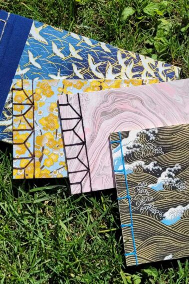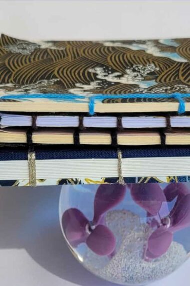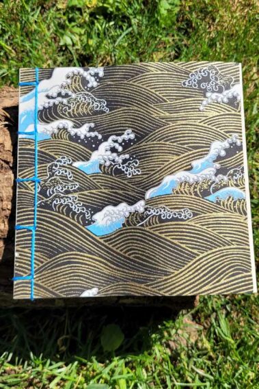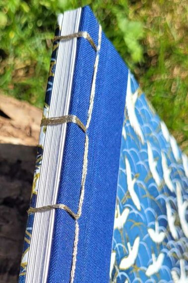 La reliure japonaise est une technique parfaite pour s’initier à la reliure. Les feuilles du carnet ou du livre sont cousues, sans colle. De cachée, la couture devient un ornement à part entière que l’on peut associer avec les papiers des couvertures.